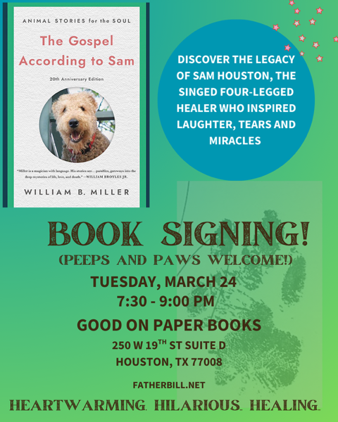 Join us on Friday, October 3rd, 5:45 p.m. at Saint Cecilia's Round Top for the official book launch for The Gospel According To Sam: Animal Stories for the Soul (20th Anniversary Edition). We will enjoy an evening of inspiring songs and stories. Musicians Ellen Melissa Story, Stephen Mansolo, and Keenan-Keaton Payne will be joined by the acclaimed jazz pianist and composer Paul English, to share some great music. Author and priest William B. "Father Bill" Miller will present a preview of the new stories from Sam, and a surprise canine guest may join us as well. There will be a reception and book signing as well. All are invited so join us in Round Top, Texas for this special evening!